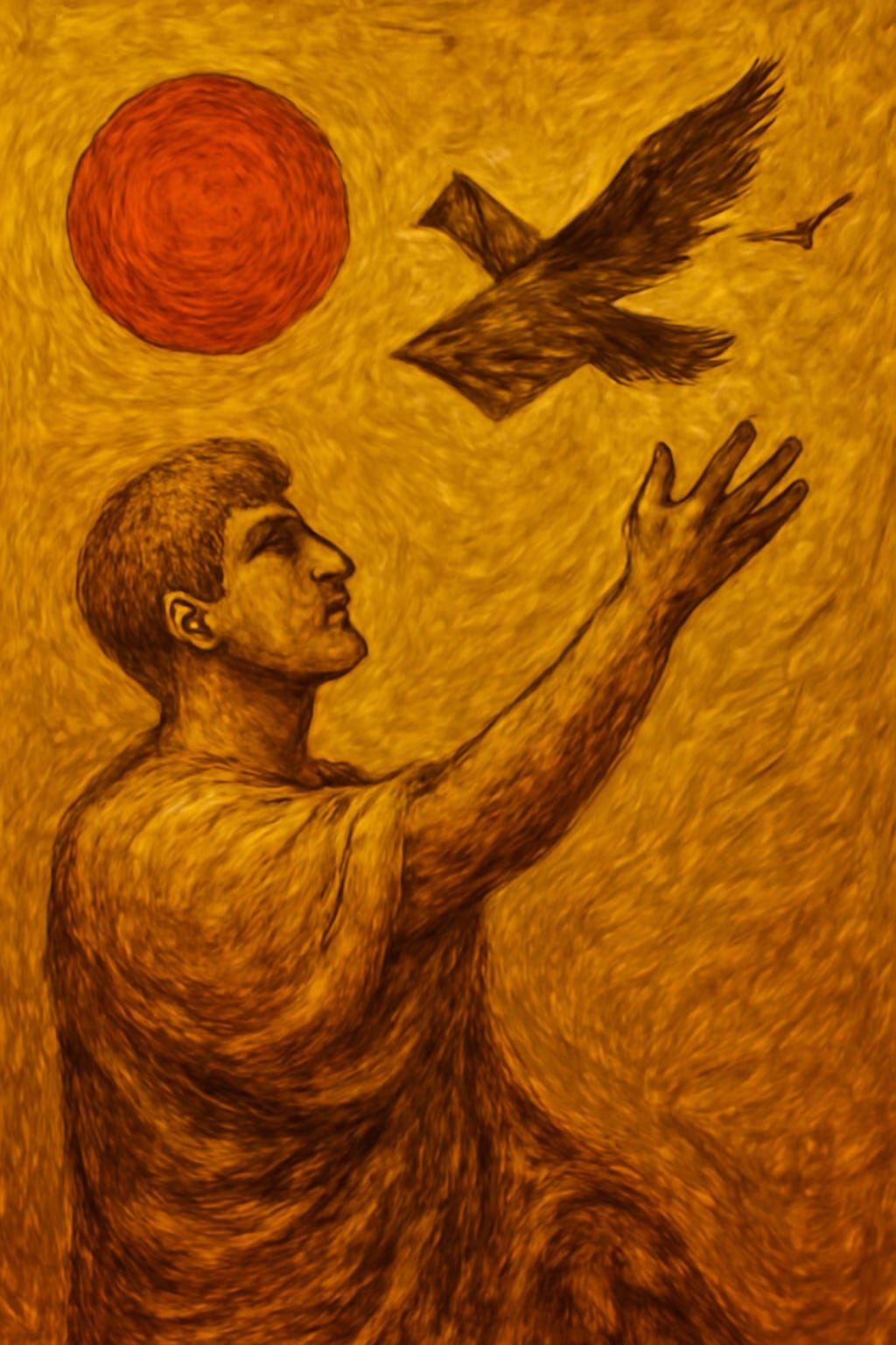 Imaginea de mai jos reprezintă renunțarea la cărți de care vorbește Marcus Aurelius. Cartea aruncată, din mâna lui Marcus Aurelius, spre cer se transformă în pasăre.